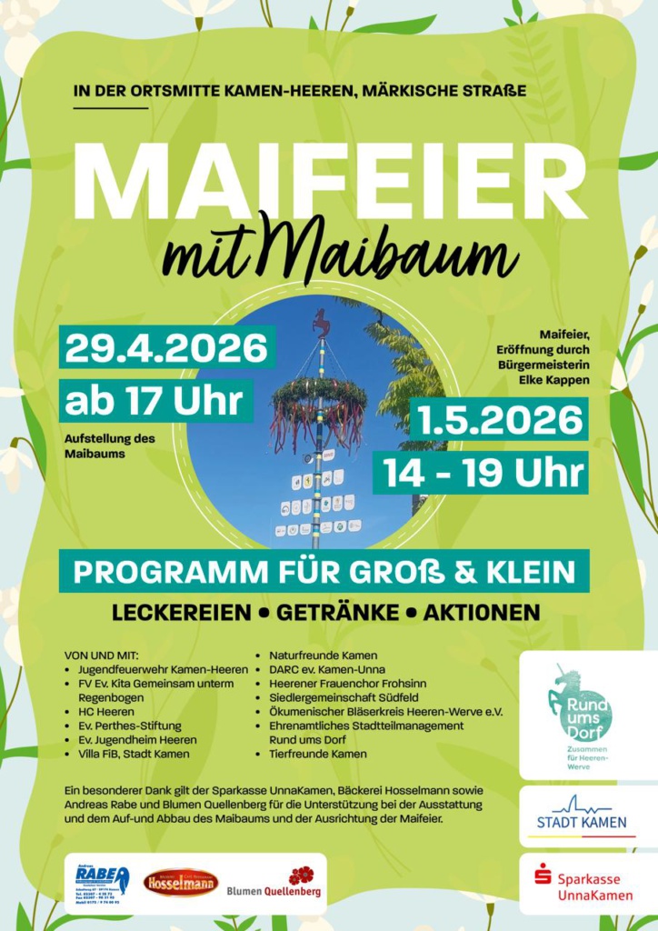 Bereits zum 5. Mal findet in diesem Jahr die Heerener Maifeier rund um den Maibaum in der Ortsmitte statt. Auch der HC Heeren-Werve ist in diesem Jahr dabei und betreibt einen Getränkestand. Am 1.5. sind wir von 14 bis 19 Uhr vor Ort und freuen uns über viele durstige Besucherinnen und Besucher. Kommt gerne vorbei und stoßt mit uns an, wir freuen uns! Natürlich gibt es auch leckere Speisen und wie in jedem Jahr auch ein abwechslungsreiches Kinderprogramm. Kommt also gerne vorbei und feiert mit!